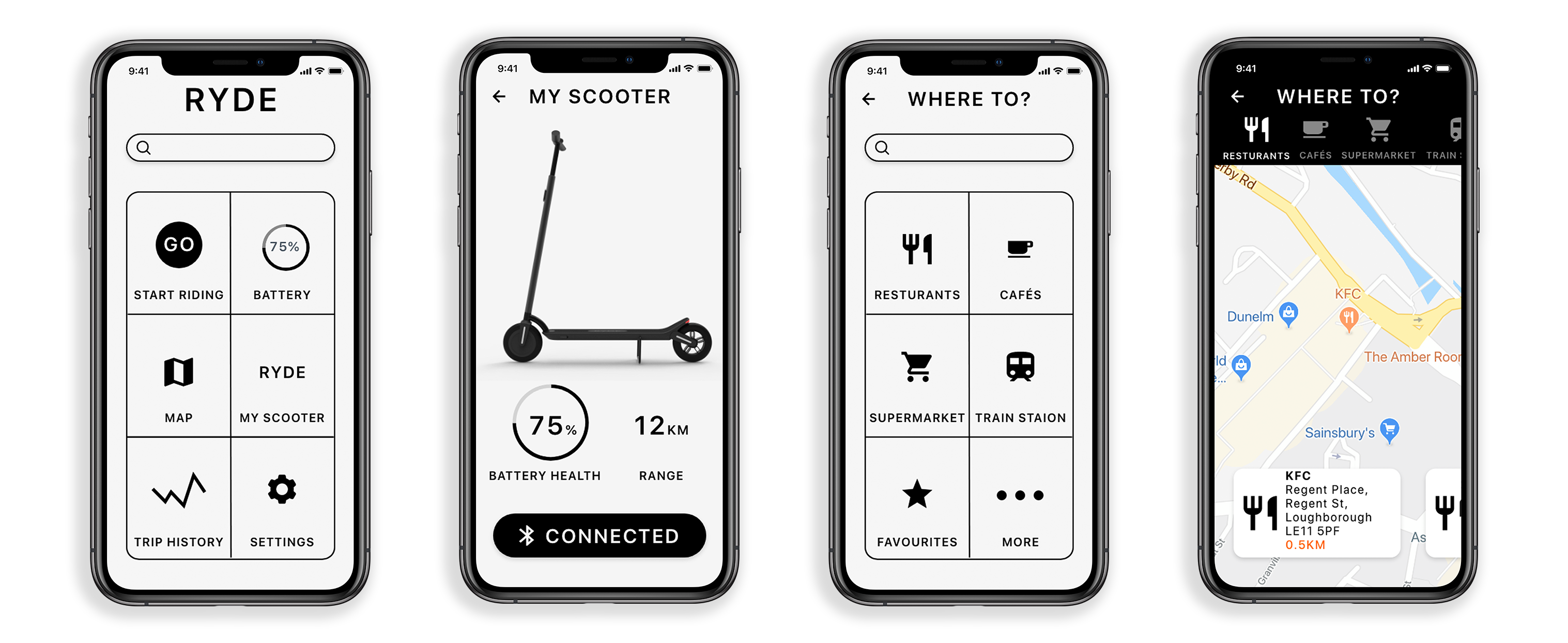RYDE is a conceptual project combining both UI and industrial design. RYDE is a smart, modular scooter as well as an app that connects to the scooter via bluetooth . The scooter also integrates a navigation system and would utilise machine learning to become accustomed to the users routes over time. The RYDE scooter and app combine together to form a system that addresses the growing congestion issues in cities, first and last mile travel, leisure and walking replacement.